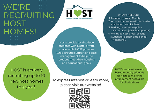 HOST (Housing Options for Students Today) Inc. is a 501c3 nonprofit providing core programs for college students experiencing homeless and/or housing insecurity. HOST's flagship program - the Host Home Program - is a strategy to address housing needs without physical infrastructure. Because the Host Home Program requires no infrastructure investment, it is a cost-efficient model for addressing the short term housing needs of students.
